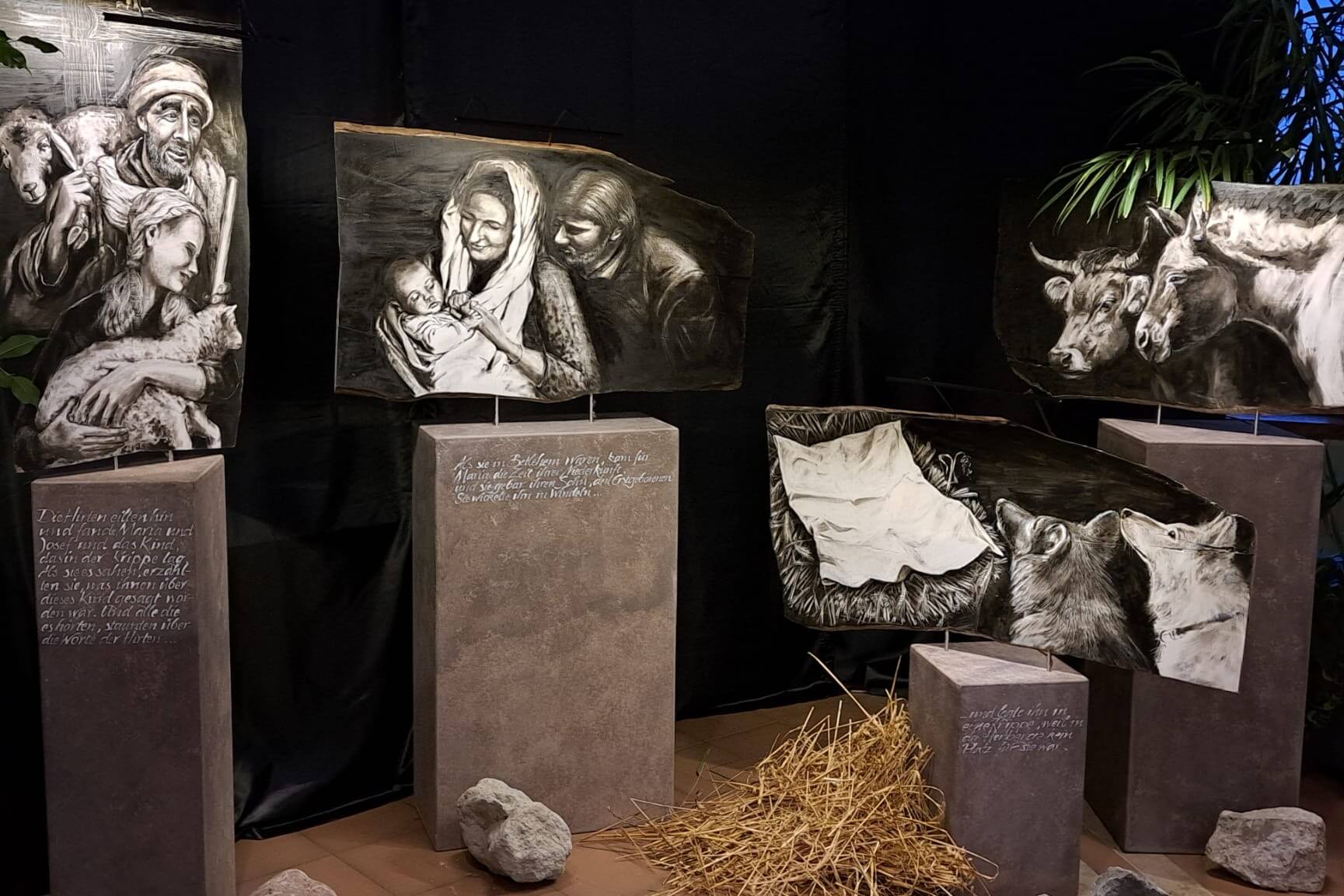 In der Kirche Mariä Himmelfahrt ist in diesem Jahr eine besondere Krippe zu sehen. Sie stammt vom Künstler Heinrich Wolf aus meiner Heimat Bad Wörishofen. Ausdrucksstarke Bilder in schwarz-weiß erzählen vom Wunder der Weihnacht. Auf den Stelen darunter deuten die passenden Bibelverse das weihnachtliche Geschehen. Eine entsprechende Beleuchtung setzt die Bilder in Szene.